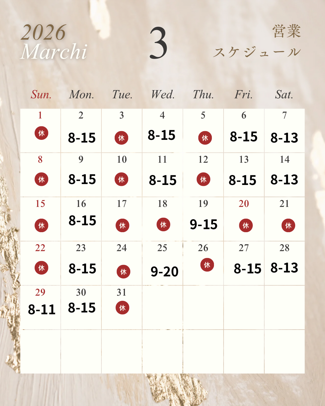 | 営業時間 完全予約制 | 月.水.金曜日 8時〜16時半 |
